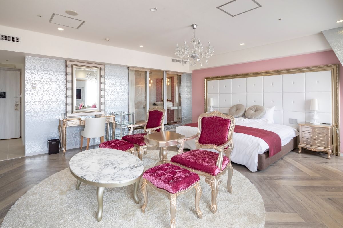 プリンセスが住んでいるようなピンクを基調とした客室で、恋人やご友人と