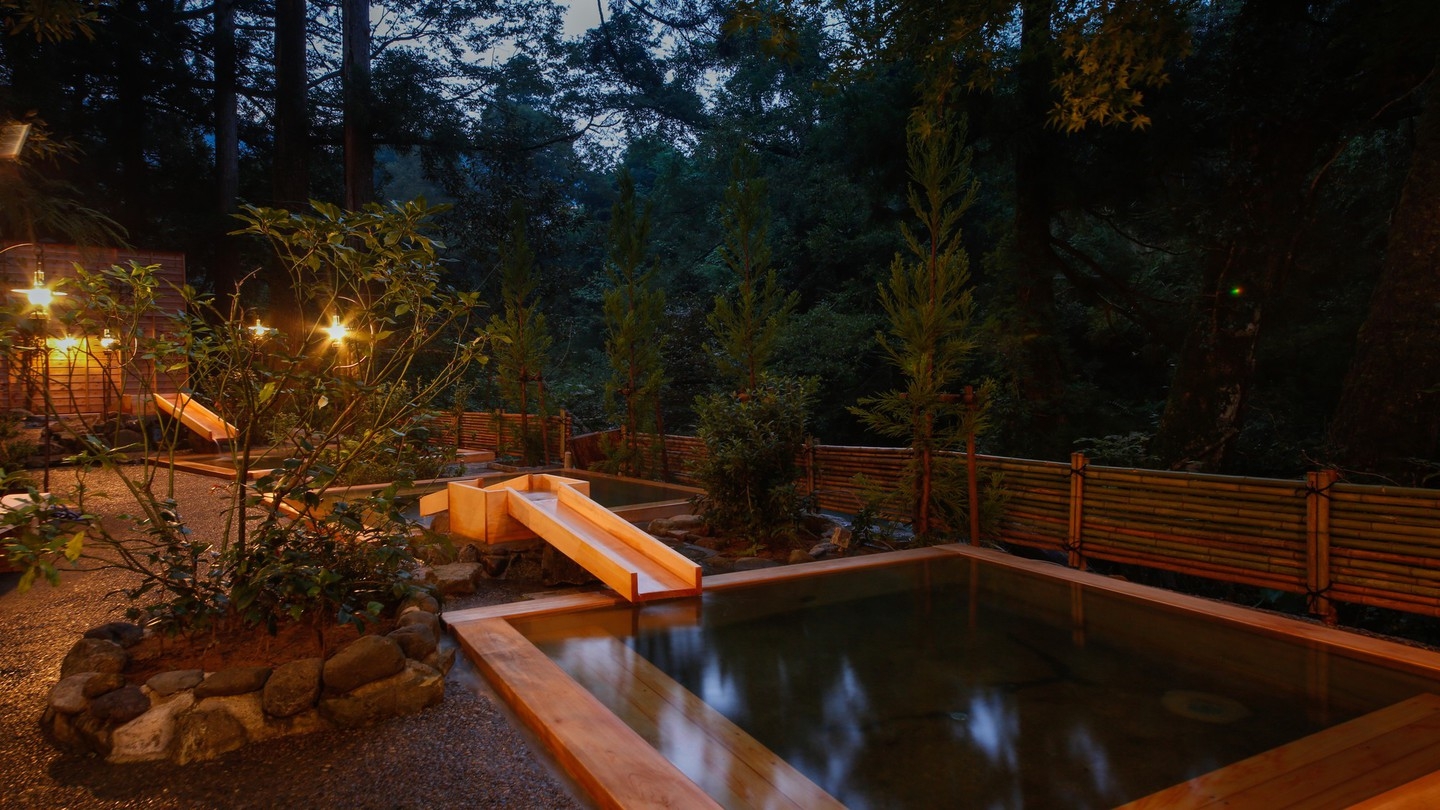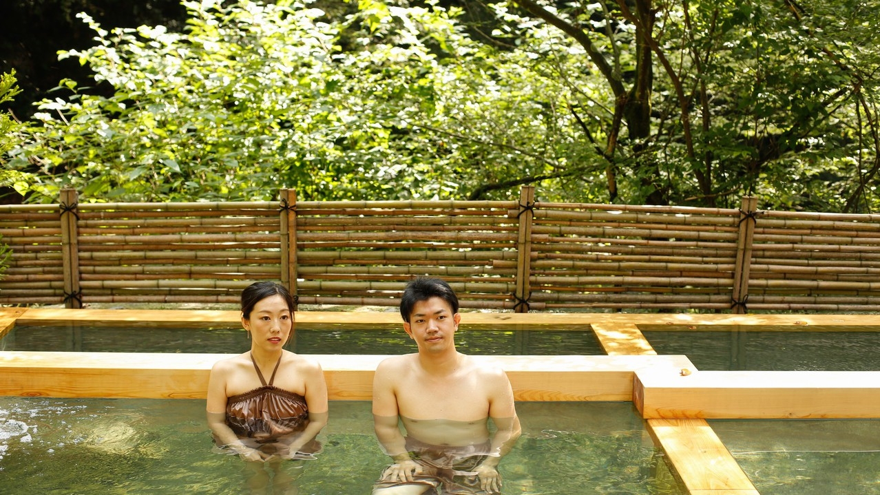 渓流沿いにまるで段々畑のようにいくつもの湯舟が連なり、専用の湯浴み着を着用いただき男女区別なくプール感覚で楽しめる野天風呂がございます。