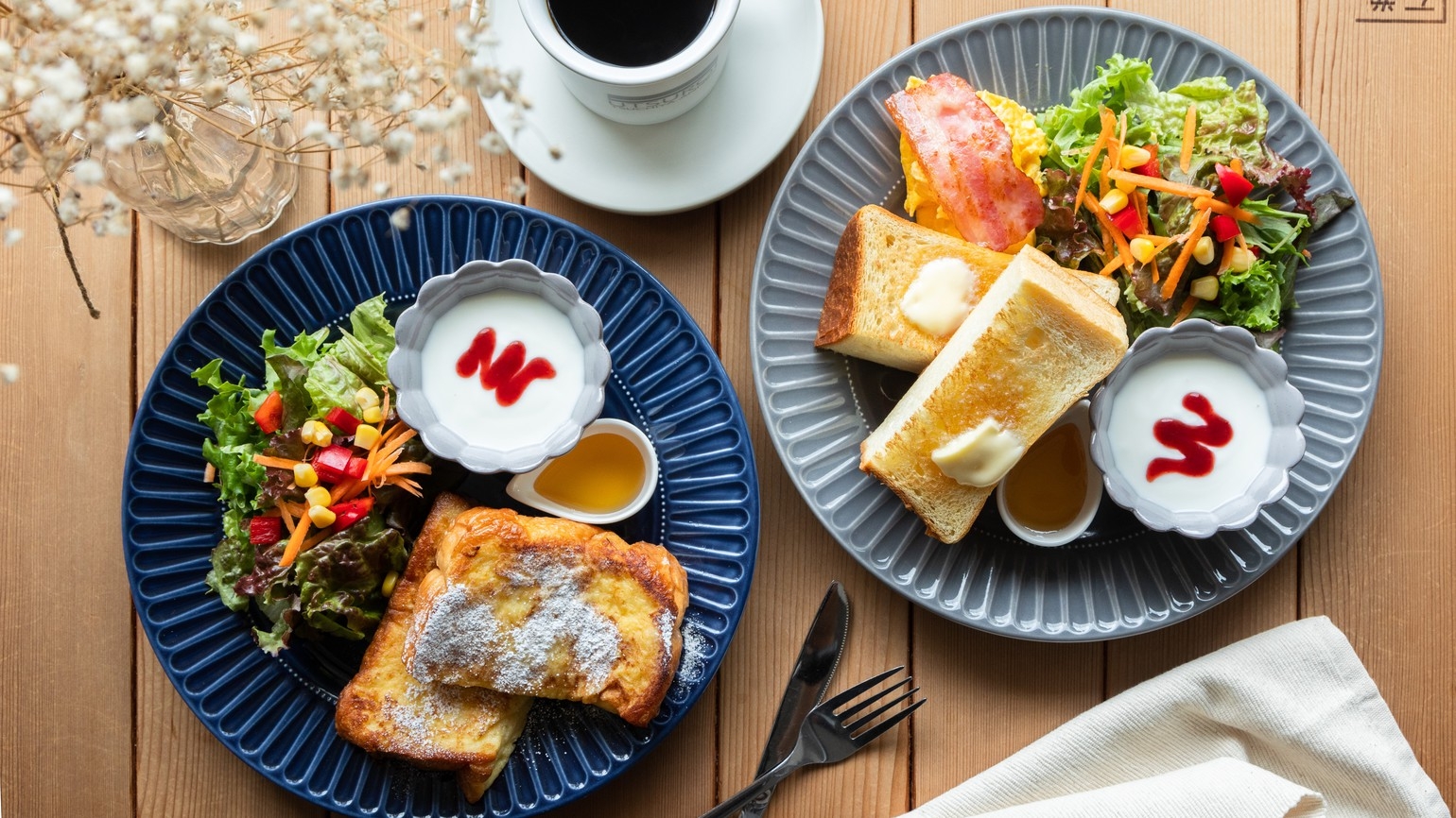 朝食は向かいにあるUTSUROIカフェにてこだわりの洋食モーニングをご用意します。(8:00〜9:30)