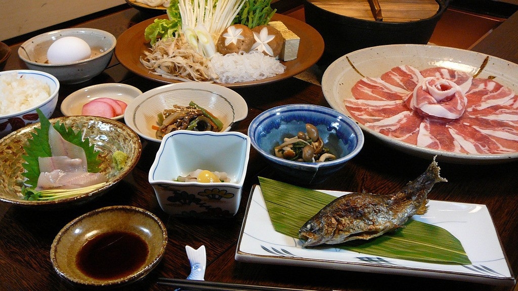 川魚の洗い、季節の小鉢数種、川魚の塩焼き、牡丹鍋、うどん、雑炊又はご飯、デザート
