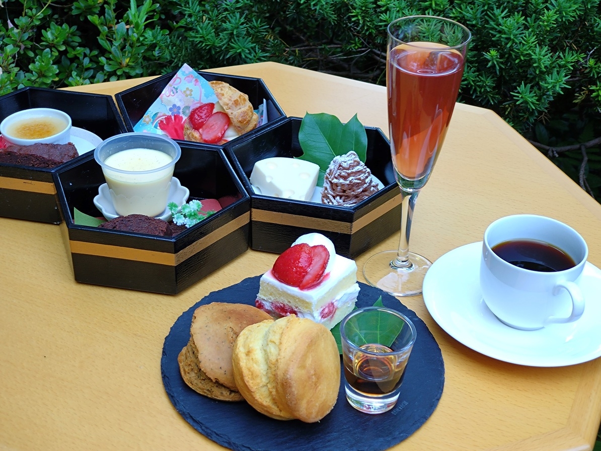 加賀棒茶のブリュレなどに加え、パンやお寿司などのセイボリーもご用意。