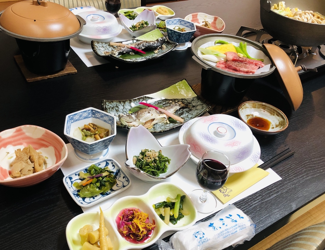 春は山菜の天婦羅や新鮮な山菜のお浸し、夏は保存された山菜を使った郷土料理、秋は豊富なきのことアケビ、芋煮汁、冬は体を温めるきのこ鍋をご用意。山形牛や川魚料理、地元野菜も季節に合わせて変化し、炊き込みご飯やデザートも楽しめます。