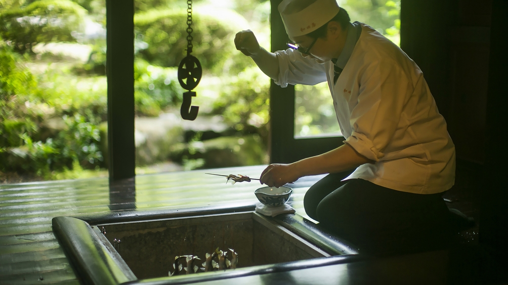 ご夕食には必ず、当館自慢の「囲炉裏」を使ったお料理をご提供します。