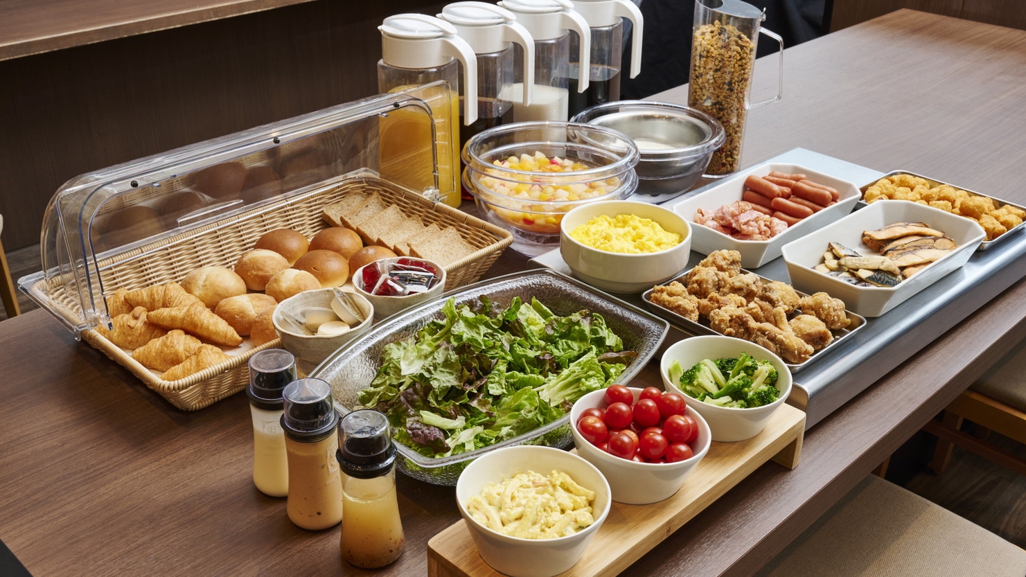その他 :ベーコン・ウィンナー・ハッシュドポテト・スクランブルエッグ 焼き魚(鮭、鯖)・たくあん・味付け海苔・ごはん