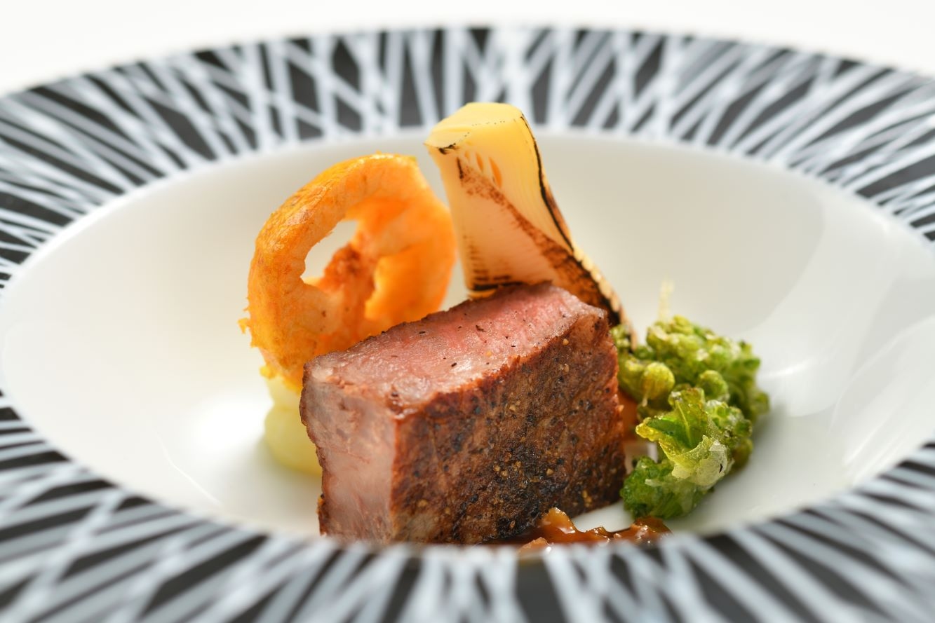 山形牛のローストふきのとうソース・本鮪の一点盛り、他