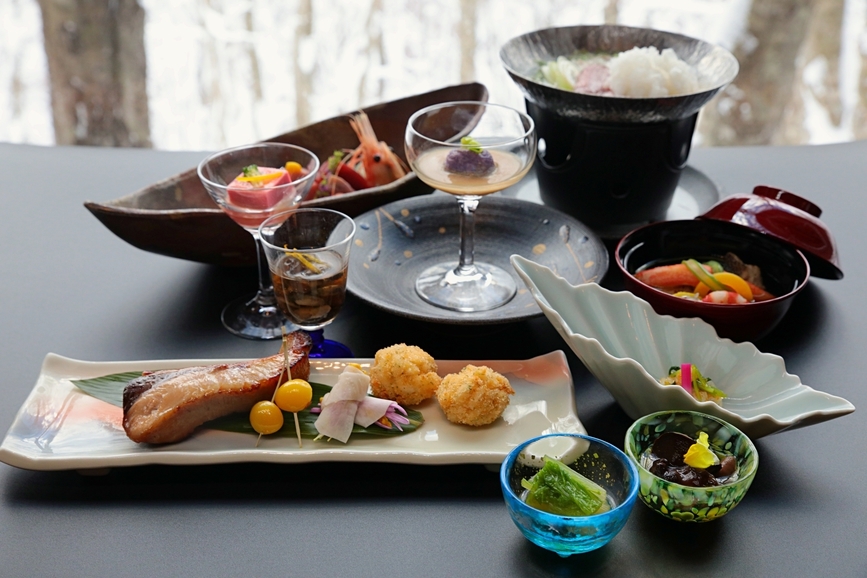 熟練の調理人が作り出すこの地ならではの、その季節の旬の地元食材を調理した和食会席料理と、窓の外に広がる美しく変化していく南八甲田の四季折々の景色をお楽しみいただき、特別な旅行に彩りを添える、贅沢なひと時をお楽しみください。