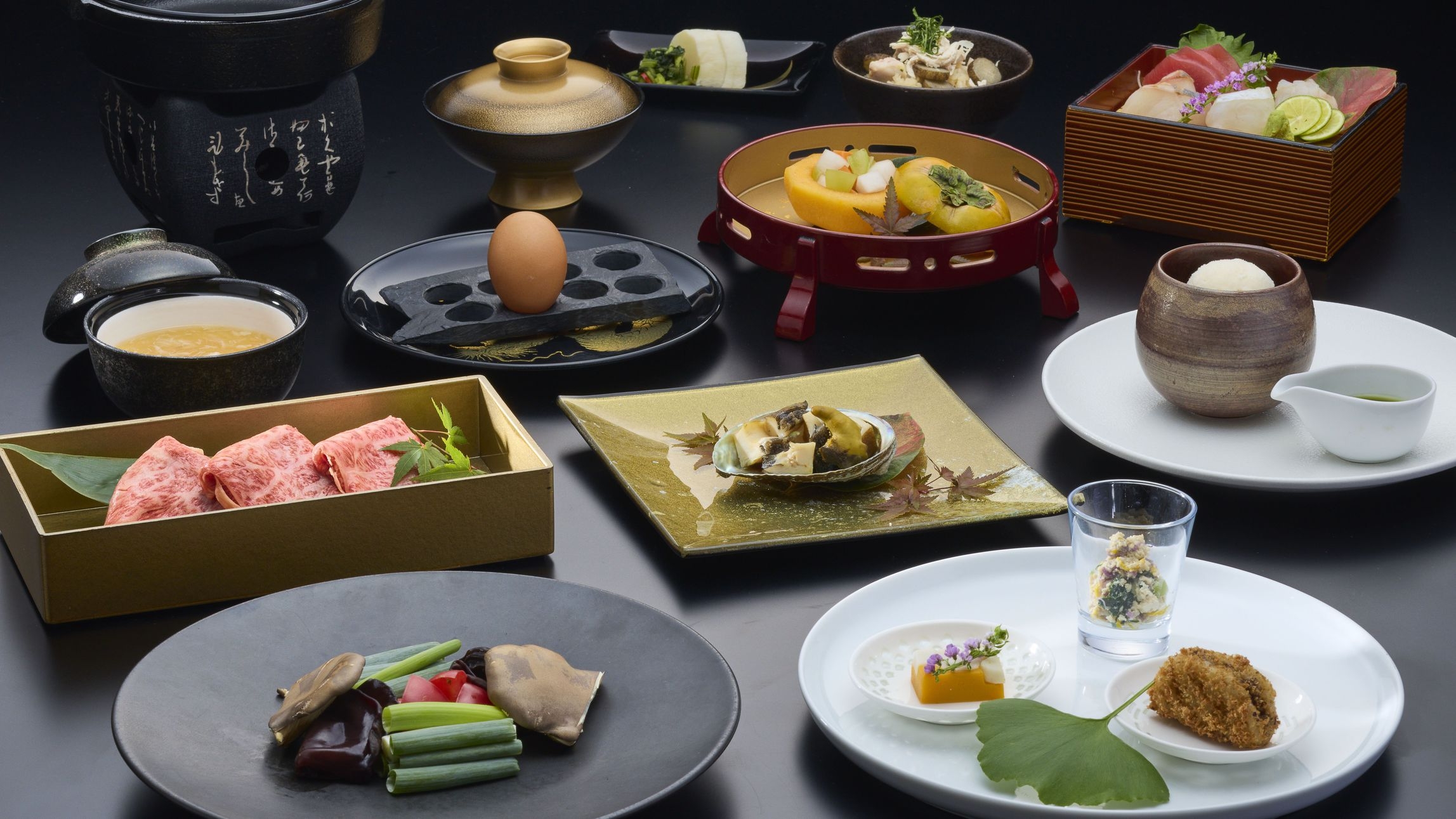 紀伊半島の潮風と雨で育んだ山の幸の熊野牛・伊賀牛・松阪牛など四季折々の料理を熊野灘を眺めながらお楽しみいただけます。